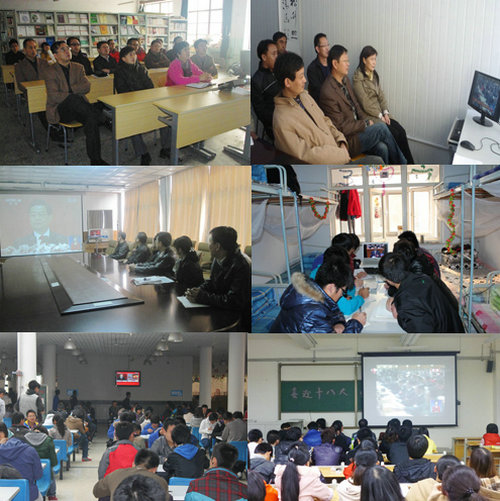 各学院(部)组织广大党员干部在学院会议室,团委、学生处组织学生干部、党员分别在四方校区的报告厅,黄岛校区的食堂收看收听党的十八大开幕式,了解党的十八大会议盛况,并组织学习讨论 。临沂校区组织全体教工党员和机关职工在办公楼二楼会议室集中收看中国共产党第十八次全国代表大会开幕式盛况,各系(部)教工和部分学生党员、入党积极分子由学工部、各系(部)组织在教室或办公室收看实况,并要求各党支部和全体党员继续收听收看十八大有关实况直播,认真学习和领会会议精神,把十八大精神贯彻落实到本职工作中。