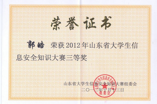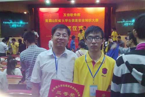 10月13日,首届山东省大学生信息安全知识大赛决赛在山东大学闭幕。伟德官网环境工程2010级郭皓同学在路成刚老师的带领下参加比赛获得三等奖。省政协副主席陈光、团省委书记王磊、省经信委副主任高方、山东大学党委副书记方宏建等出席大赛颁奖仪式。团省委副书记陈必昌主持仪式。