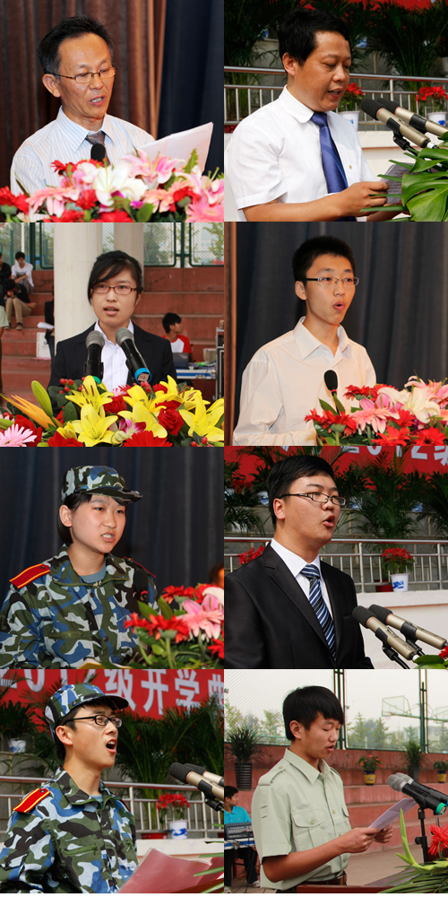 建筑学院院长郝赤彪教授、计算机工程学院院长王斌教授、机电工程系付立悦老师分别作为教师代表发言。环境与市政工程学院给水排水工程专业2011级2班辛旭东、计算机工程学院软件工程专业2010级5班白镇源分别作为在校生代表发言。建筑学院建筑学专业2012级2班李潇然、土木工程学院土木工程专业2012级10班金凯、机电工程系机械设计制造及其自动化专业杨石磊分别作为新生代表发言。