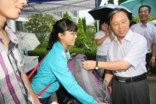 薛书记、仪校长冒着淅淅沥沥的小雨,一一走访视察了各学院新生报到点、绿色通道处、军训服装分发处、学生宿舍等,并与新生、家长、学生工作干部、学生志愿者亲切交流,并为困难新生发放爱心大礼包。