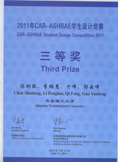 日前,由中国制冷学会(CAR)、ASHRAE(美国供热制冷空调工程师学会)和全国高等学校建筑环境与设备工程学科专业指导委员会主办的2011年CAR-ASHRAE学生设计竞赛圆满结束。经过竞赛评审委员会三轮审查、反复商议、多次投票,共评出学生获奖作品10份,其中一等奖1名、二等奖2名、三等奖3名、入围奖4名。伟德官网学子陈树栋、李鹏慧、元峰、郭云峰等同学组成的团队获全国三等奖。