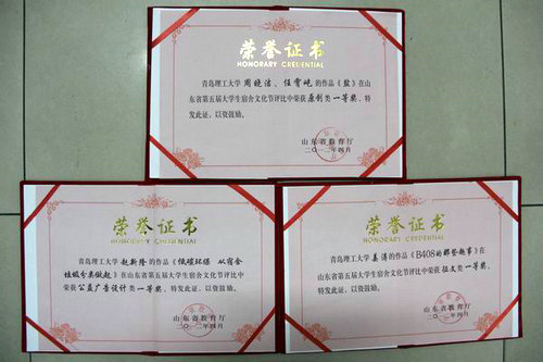 伟德官网在山东高校第五届大学生宿舍文化节活动中认真组织、积极筹备,广大同学积极参与,取得了丰硕的成果。学校荣获山东省高校第五届大学生宿舍文化节“优秀组织奖”,李忠晓、韩永剑获“优秀指导奖”荣誉称号。学校报送的多项作品获奖,共获得大学生宿舍文化节展板类一等奖、大学生宿舍文化节巡礼类三等奖,以及四个单项中的三个一等奖,其中赵新隆同学的作品《低碳环保 从宿舍垃圾分类做起》荣获公益广告设计类一等奖,姜涛同学的作品《B408的那些事》荣获文化征文类一等奖,周晓洁、任宵屹同学的作品《盐》荣获原创类一等奖。此外,周珈羽、李东同学的作品《Dancestry Show》、马夹、梁建同学的作品《盗梦空间》荣获原创类二等奖;刘子文同学的作品《低碳从身边做起》荣获公益广告设计类二等奖;蔡加婧同学的作品《我的新宿舍》荣获文化征文类二等奖;李晓鹏同学的作品《那年,谁住在我的隔壁》荣获文化征文类三等奖。