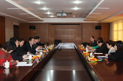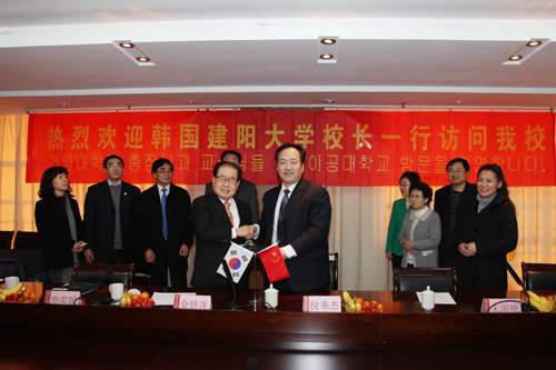 1月4日,韩国建阳大学校长金熺洙一行五人来到伟德官网,进行友好访问。校长仪垂杰在图书科技楼会议室会见了建阳大学代表团一行,并与该校校长金熺洙分别代表双方签署了友好合作、姊妹学校等协议。