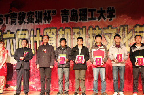 随后,本届计算机科技文化节的突出贡献奖、一二三等奖和科技创新标兵等奖项一一揭晓,杨向荣副书记宣读获奖名单。青岛软件园获得“突出贡献奖”,李鑫、焦翔等4名同学获得科技创新标兵,张艺修等38人获得各项比赛的一二三等奖,与会嘉宾分别为获奖单位和个人颁奖。颁奖期间,来自计算机工程学院的学生还带来了精彩的文艺演出,颁奖典礼在计算机工程学院朗诵队带来的朗诵《我是大学生,我必铸就辉煌》中落下帷幕。