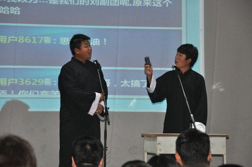 一曲轻快激昂的歌曲《自由》将整个晚会的气氛点燃,大屏幕上一组组照片记录了新生军训的点点滴滴,展现了新生们朝气蓬勃的青春。随后,精彩节目一一上演。四方校区,由新生表演的相声《养宠物》,赢得观众的阵阵掌声和喝彩声;动感绚丽的街舞、悠扬婉转的笛子独奏、搞笑幽默的小品相继呈现,黄岛校区的现场更采用了短信祝福的方式,将同学们的祝福及对大学生活的憧憬投映到大屏幕上。节目精彩纷呈、高潮迭起,博得在场师生的热烈好评。