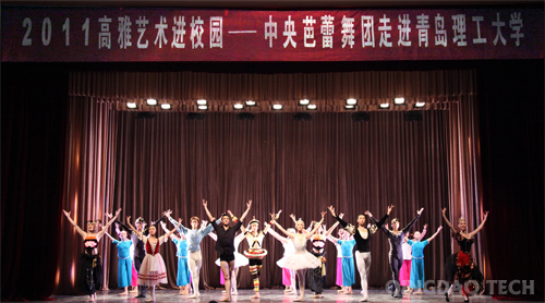 校党委书记耿喜华与中央芭蕾舞团副团长王全兴互赠了写有“革故鼎新 集西方艺术之大成;薪火相传 扬华夏文化之精髓”的锦旗与纪念品。校党委副书记杨向荣致欢迎辞。学校各学院、部门的领导老师、媒体记者及2000多名学生观看了演出。