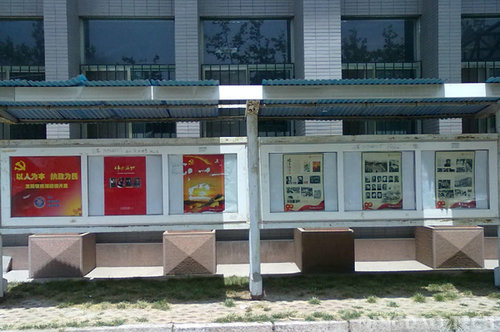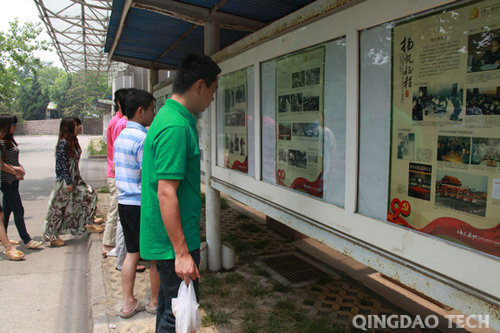 科技楼南广场橱窗图片分为百年屈辱、开天辟地、大革命洪流和土地革命中成长、抗日战争中的中流砥柱、夺取民族革命的全国性胜利、社会主义过渡和建设社会主义道路的探索、开创中国特色社会主义新局面和科学发展谱新篇八个部分。