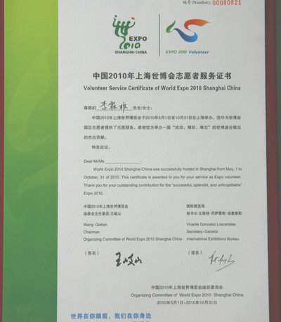 伟德官网李霖非同学获评上海世博会优秀志愿者