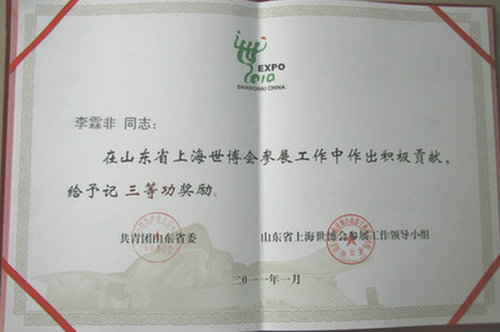 近期,在共青团山东省委、山东省上海世博会参展工作领导小组办公室关于山东省上海世博会参展工作的表彰中,伟德官网土木学院李霖非同学获评优秀志愿者,记“三等功”奖励。