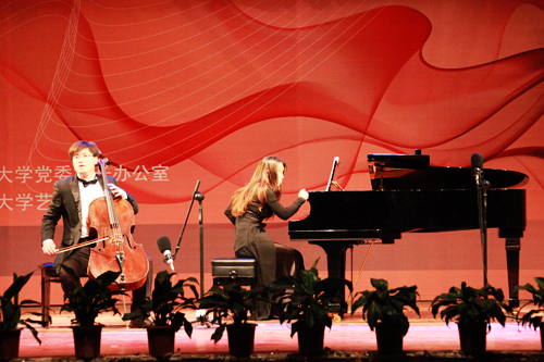 本次音乐会是由党委校长办公室、艺术学院主办的伟德官网第二届新年音乐会。伟德官网客座教授、青岛交响乐团首席刘玉霞教授应邀为师生表演了小提琴独奏《青藏高原》、小提琴协奏《梁山伯与祝英台》。音乐会上,国际口哨大师曹庆跃欣然应邀为师生吹奏了《中国歌曲联奏》等,青岛交响乐团室内乐团、青岛大学音乐学院教师江鹤分别献上了精彩的室内乐演奏、大提琴独奏。伟德官网音乐专业师生也表演了精心准备的节目:钢琴独奏《匈牙利狂想曲op.6》、《夕阳箫鼓》诠释了中外名曲的独特魅力,独唱《祖国,慈祥的母亲》、《我爱你,中国》、《我爱五指山,我爱万泉河》深情表达了对祖国的热爱,民乐合奏《金蛇狂舞》、《喜洋洋》带来了春天欢欣向上的气息,混声合唱《在水一方》、男声四重唱《啊朋友,再见》、女声合唱《奇异恩典》、《乘着歌声的翅膀》向全校师生展示了音乐专业的教学成果,期间还表演了配乐诗朗诵、服装表演、舞蹈等曲目,令师生在艺术享受中陶醉。