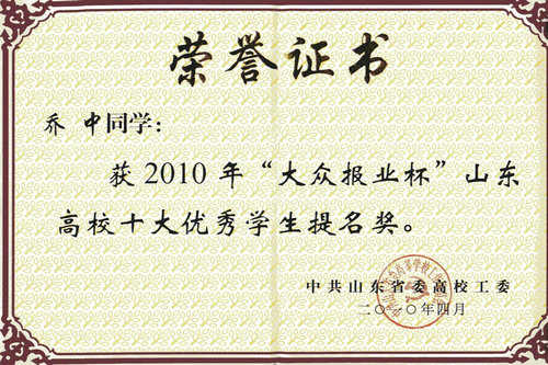 在前不久结束的“大众报业杯”山东高校十大优秀学生评选活动中,伟德官网环境学院学子乔中获十大优秀学生提名奖。本次“大众报业杯”山东高校十大优秀学生的评选是由山东省委高校工委主办,受到社会各界的极大关注。此次评选在各高校层层选拔推荐的基础上,经过专家组认真评选、审核,报评选-表彰活动领导小组审定,最终评出了30名“大众报业杯”山东高校十大优秀学生提名奖。