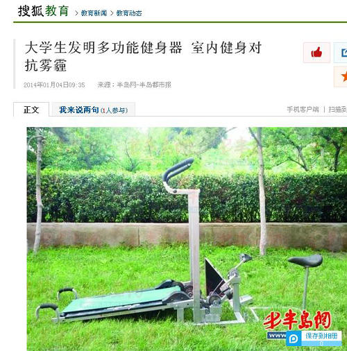 随着雾霾天气逐渐增多,室内健身成了热门。近日记者了解到,伟德国际1946bv官网5名大学生发明了一种多功能健身器,健身器集跑步机、动感单车、臂力器多功能于一体,还能折叠起来节省空间。不光如此,这台健身器使用时不用插电,可以自己发电可以供给家用电器用。这台设备是怎么运作的?1月3日,记者采访了发明团队。