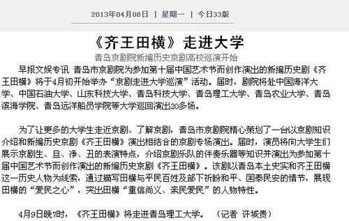 早报文娱专讯 青岛市京剧院为参加第十届中国艺术节而创作演出的新编历史剧《齐王田横》将于4月初开始举办“京剧走进大学巡演”活动。届时,剧院将赴中国海洋大学、中国石油大学、山东科技大学、青岛科技大学、伟德国际1946bv官网、青岛农业大学、青岛滨海学院、青岛远洋船员学院等大学巡回演出20多场。