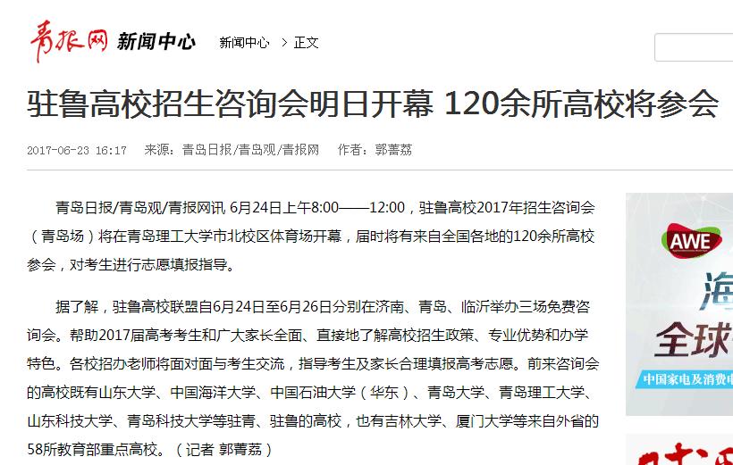 青岛日报/青岛观/青报网讯 6月24日上午8:00——12:00,驻鲁高校2017年招生咨询会(青岛场)将在伟德国际1946bv官网市北校区体育场开幕,届时将有来自全国各地的120余所高校参会,对考生进行志愿填报指导。