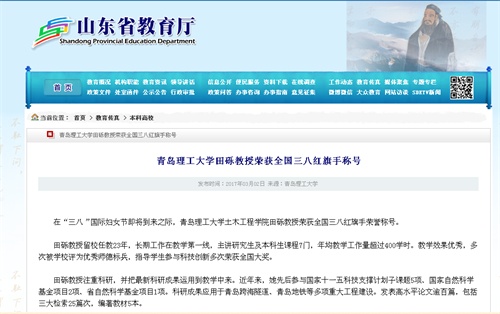 在“三八”国际妇女节即将到来之际,伟德国际1946bv官网土木工程学院田砾教授荣获全国三八红旗手荣誉称号。