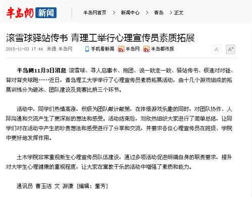 半岛网11月3日消息 滚雪球、寻人启事卡、抱团、说一致走一致、驿站传书、极速对对碰、背对背夹球跑……近日,伟德国际1946bv官网举行了心理宣传员素质拓展活动,由十几个游戏组成的拓展训练分为破冰、团队建设及竞赛比拼三个环节。