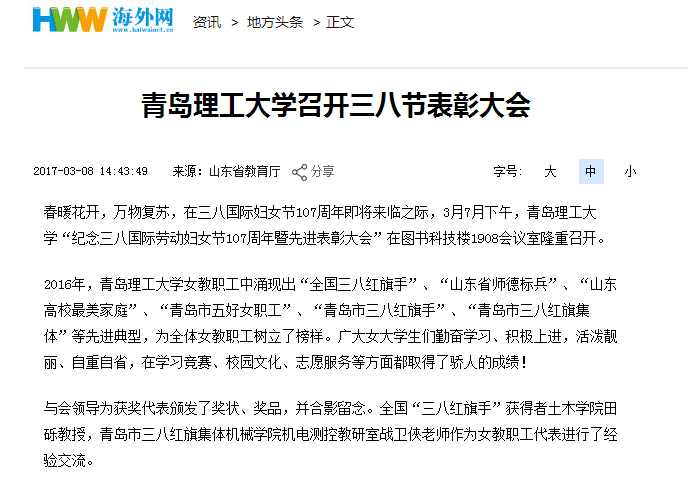 与会领导为获奖代表颁发了奖状、奖品,并合影留念。全国“三八红旗手”获得者土木学院田砾教授,青岛市三八红旗集体机械学院机电测控教研室战卫俠老师作为女教职工代表进行了经验交流。