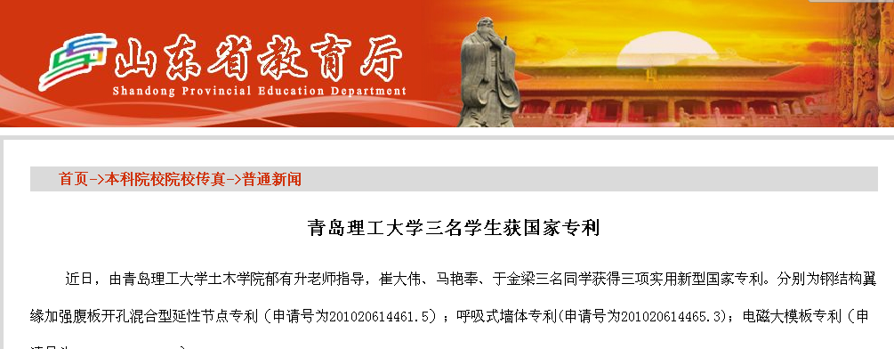 近日,由伟德国际1946bv官网土木学院郁有升老师指导,崔大伟、马艳奉、于金梁三名同学获得三项实用新型国家专利。分别为钢结构翼缘加强腹板开孔混合型延性节点专利(申请号为201020614461.5);呼吸式墙体专利(申请号为201020614465.3);电磁大模板专利(申请号为 201020614487.X)。