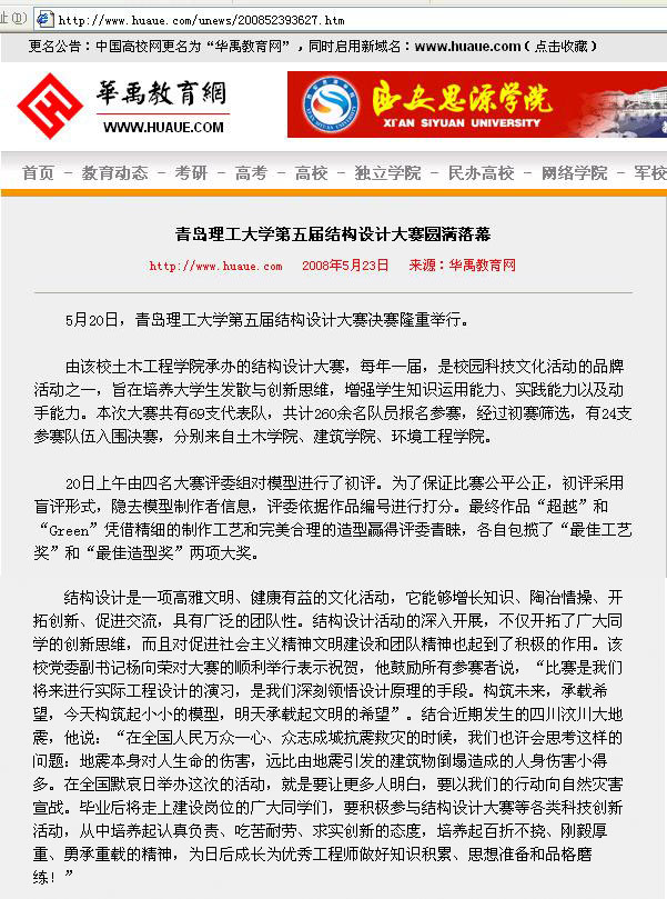结构设计是一项高雅文明、健康有益的文化活动,它能够增长知识、陶冶情操、开拓创新、促进交流,具有广泛的团队性。结构设计活动的深入开展,不仅开拓了广大同学的创新思维,而且对促进社会主义精神文明建设和团队精神也起到了积极的作用。该校党委副书记杨向荣对大赛的顺利举行表示祝贺,他鼓励所有参赛者说,“比赛是我们将来进行实际工程设计的演习,是我们深刻领悟设计原理的手段。构筑未来,承载希望,今天构筑起小小的模型,明天承载起文明的希望”。结合近期发生的四川汶川大地震,他说:“在全国人民万众一心、众志成城抗震救灾的时候,我们也许会思考这样的问题:地震本身对人生命的伤害,远比由地震引发的建筑物倒塌造成的人身伤害小得多。在全国默哀日举办这次的活动,就是要让更多人明白,要以我们的行动向自然灾害宣战。毕业后将走上建设岗位的广大同学们,要积极参与结构设计大赛等各类科技创新活动,从中培养起认真负责、吃苦耐劳、求实创新的态度,培养起百折不挠、刚毅厚重、勇承重载的精神,为日后成长为优秀工程师做好知识积累、思想准备和品格磨练!”