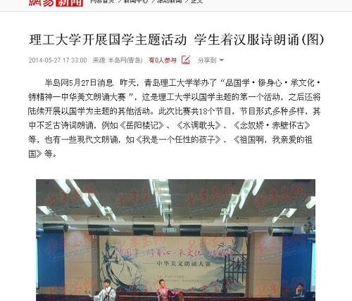 半岛网5月27日消息 昨天,伟德国际1946bv官网举办了“品国学·修身心·承文化·铸精神—中华美文朗诵大赛”,这是理工大学以国学主题的第一个活动,之后还将陆续开展以国学为主题的其他活动。此次比赛共18个节目,节目形式多种多样,其中不乏古诗词朗诵,例如《岳阳楼记》、《水调歌头》、《念奴娇·赤壁怀古》等,也有一些现代文朗诵,如《我是一个任性的孩子》、《祖国啊,我亲爱的祖国》等。