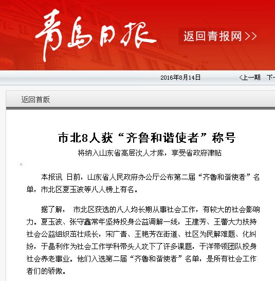 本报讯 日前,山东省人民政府办公厅公布第二届“齐鲁和谐使者”名单,市北区夏玉波等八人榜上有名。