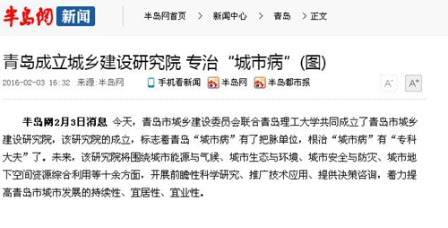 青岛市城乡建设研究院的成立,标志着青岛市城乡建设发展有了全方位技术支撑为平台的“智库”了,从而使青岛在不同阶段发展而引起的城市病有了把脉单位,根治城市病有专科大夫了。据悉,该研究院将围绕当前我国城市化进程中出现的人口膨胀、交通拥堵、环境恶化、资源短缺等共性问题以及青岛城市建设发展中的个性表征,充分发挥校政双方的优势,集聚国内外行业领域内的知名专家、学者,在新型城镇化与城乡一体化发展、城市信息技术与智慧城市、城市能源与气候、城市生态与环境、城市安全与防灾、城市地下空间资源综合利用、历史文化名城名镇名村保护与利用、城市水文与海绵城市、城市基础设施工程建设与技术、城市综合交通与道桥、城乡住房改革与发展、城市更新与遗产保护、城市规划与设计、城市管理与政策等十余方面,开展前瞻性科学研究、推广技术应用、提供决策咨询,着力提高青岛市城市发展的持续性、宜居性、宜业性,努力为青岛市岛率先全面建成较高水平小康社会、加快建设宜居幸福的现代化国际城市贡献力量。