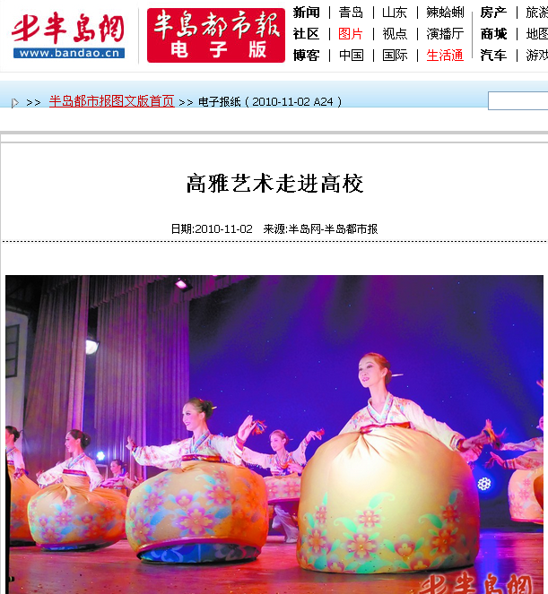 11月1日,伟德国际1946bv官网礼堂内,中国东方演艺集团东方歌舞团的演员们正在表演朝鲜舞蹈《铃铛》,开始了“高雅艺术进校园”青岛站的首场演出。据了解,该活动将持续至11月5日,接下来将依次走进中国海洋大学 、青岛科技大学 、青岛农业大学 、飞洋职业技术学院进行演出。记者 黄英帅