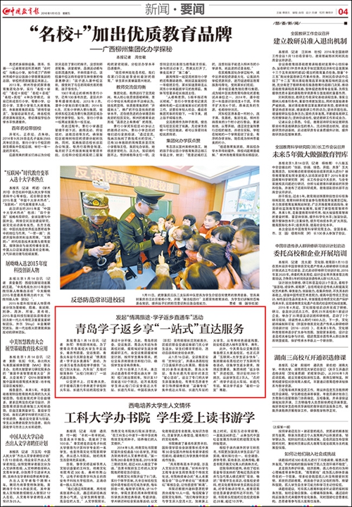 此外,今天青岛公交集团在青岛理工大黄岛校区,也正式开通“互联网+大学生返乡快车”。集团提前在高校进行了互联网问卷活动,征集学生返乡需求。按照反馈需求,集团将把“返乡快车”开进校园,预计安排200个班次,运送学生近2万人,“点对点”将学子送达火车站、长途汽车站,解决学子返乡“最初一公里”难题。