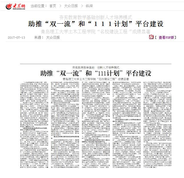 学院吕平教授主持的《材料科学与工程专业创新课程体系建设项目》针对当前国家“一带一路”建设、山东半岛蓝色经济区建设等重大需求,建设以土木工程材料与海洋涂层材料为特色的无机非金属材料与高分子材料两大专业方向,培养亟需的高水平应用型高级专业技术人才,能较好地满足国家及地区当前社会发展需求。项目立足专业定位及学科基础,构建国家级区域经济发展亟需的材料科学与工程人才培养方案与创新课程体系;依托国家“111计划”海洋环境混凝土技术创新引智基地、“蓝色经济区工程建设与安全”山东省协同创新中心等平台建设及《土木工程材料》等国家精品资源共享课程、国家级双语教学示范课程建设,培养具有创新能力、工程实践能力强的应用型高级专门人才。将学科前沿科研成果与工程新技术转化为教学及创新实践内容,提高学生科技创新能力;加强国际合作交流,提升学生的国际竞争力。