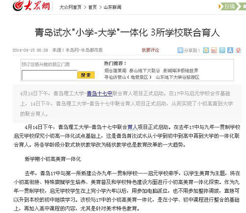 去年,青岛17中与第一所新建公办九年一贯制学校——启元学校牵手,以学生美育为主题,将在小初高衔接、特殊禀赋学生培养、美育普及和学校特色建设方面进行小初高美育一体化探索。作为九年一贯制学校,启元学校学生在上完小学六年以后,用参加电脑派位,也不用参加整体调拨,直接可以升到本校的初中继续学习。该校与17中的小初高美育一体化,是在小学、初中课程进行整合的基础上,再加入高中课程的内容,尤其是针对美术特色教育。