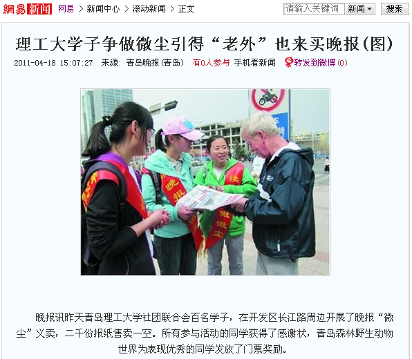在开发区现场,伟德国际1946bv官网社团联合会的李薇、曾钰、王彬、付彦楠等干事,不仅把活动安排得秩序井然,而且一路上不断地给同学们加油助威,积极参与到义卖的队伍中。彭璐、宁佳欢、徐莎莎三位同学路遇“老外”,积极用英语为他们介绍青岛“微尘”的来历,惹得外国友人纷纷夸赞,连声说晚报做得好。邱雪、杨洁、栾方蕾、贺岩、杨德升、郑成剑、施栎等同学不仅义卖所得高居榜首,而且还积极帮助其他同学。郭树明、林哲、姜正、朱琪、幸春伟、叶林、王炬等同学,还凑在一起相互交流义卖心得,“出点子、想办法”,报纸很快脱手。宿百宁同学还买来了“灰太狼”形状的气球,说要送给带孩子的献爱心者。山科大的周峰同学,上次参与了义卖但是意犹未尽,昨天又来到现场参与活动。伟德国际1946bv官网学校团委对本次活动给予了大力支持。