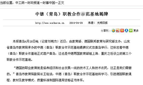 本报青岛4月28日电(记者刘艳杰)近日,由教育部、德国联邦教育与研究部主办,山东省青岛市教育局承办的中德(青岛)职教合作示范基地揭牌仪式在青岛举行,这标志着中德(青岛)职教合作基地正式落户青岛,这也是中德两国教育部继上海、重庆之后设立的第三个职教合作示范基地。
