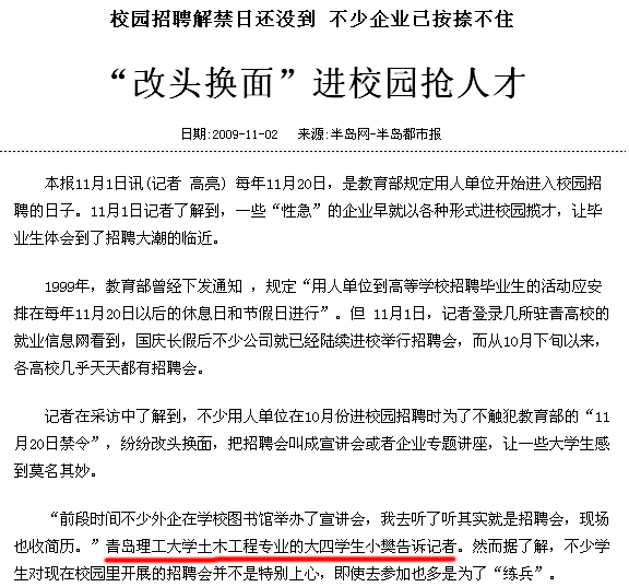 1999年,教育部曾经下发通知 ,规定“用人单位到高等学校招聘毕业生的活动应安排在每年11月20日以后的休息日和节假日进行”。但 11月1日,记者登录几所驻青高校的就业信息网看到,国庆长假后不少公司就已经陆续进校举行招聘会,而从10月下旬以来,各高校几乎天天都有招聘会。