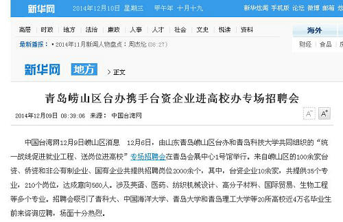 中国台湾网12月9日崂山区消息 12月6日,由山东青岛崂山区台办和青岛科技大学共同组织的“统一战线促进就业工程、送岗位进高校”专场招聘会在青岛会展中心1号馆举行。来自崂山区的100余家台资、侨资和非公有制企业、国有企业共提供招聘岗位2000余个,其中,台资企业10余家,共提供35个专业,210个岗位,达成意向560人。涉及英语、医药、纺织机械设计、高分子材料、国际贸易、生物工程等多个专业。招聘会吸引了青科大、中国海洋大学、青岛大学和伟德国际1946bv官网等20所高校近4万名毕业生前来咨询应聘,场面十分热烈。