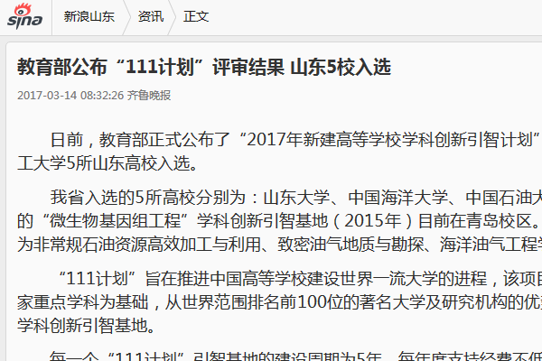 日前,教育部正式公布了“2017年新建高等学校学科创新引智计划”,即“111计划”评审结果。山东大学、中国海洋大学、中国石油大学(华东)、青岛大学、伟德国际1946bv官网5所山东高校入选。