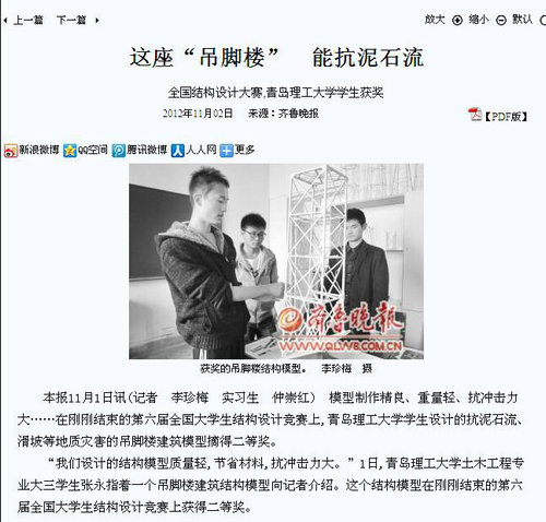 本报11月1日讯(记者 李珍梅 实习生 仲崇红) 模型制作精良、重量轻、抗冲击力大……在刚刚结束的第六届全国大学生结构设计竞赛上,伟德国际1946bv官网学生设计的抗泥石流、滑坡等地质灾害的吊脚楼建筑模型摘得二等奖。