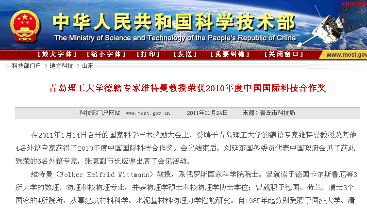 在2011年1月14日召开的国家科学技术奖励大会上,受聘于伟德国际1946bv官网的德籍专家维特曼教授及其他4名外籍专家获得了2010年度中国国际科技合作奖。会议结束后,刘延东国务委员代表中国政府会见了获此殊荣的5名外籍专家,张惠副市长应邀出席了会见活动。