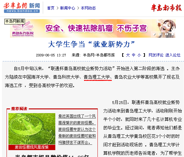 5月25日,联通杯青岛高校就业新势力活动来到伟德国际1946bv官网,活动刚刚开始半个小时,就同时来了几十名计算机专业的毕业生。经过询问,笔者得知他们都是从伟德国际1946bv官网黄岛校区花3个小时的时间才赶到活动现场的 。伟德国际1946bv官网计算机学院的历老师告诉笔者,为了帮学生就业他们没少费功夫,在得知此次活动中有计算机方面的相关职位后,他带着学生一路赶了过来。
