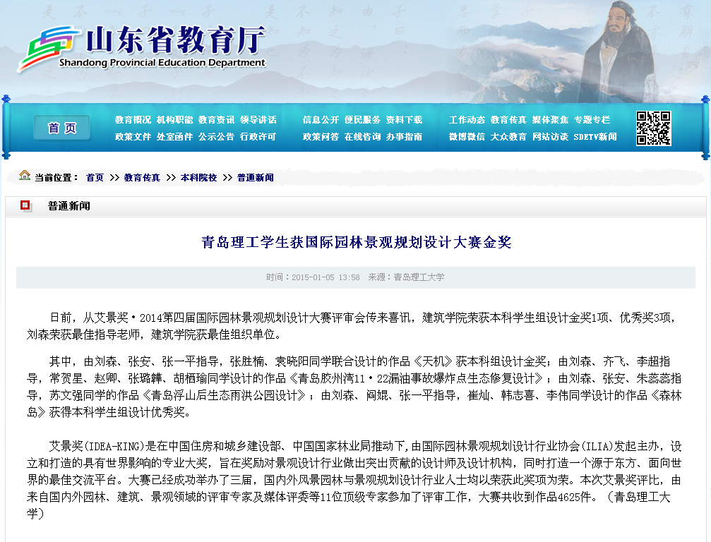 其中,由刘森、张安、张一平指导,张胜楠、袁晓阳同学联合设计的作品《天机》获本科组设计金奖;由刘森、齐飞、李超指导,常贺星、赵卿、张璐韡、胡栖瑜同学设计的作品《青岛胶州湾11·22漏油事故爆炸点生态修复设计》;由刘森、张安、朱蕊蕊指导,苏文强同学的作品《青岛浮山后生态雨洪公园设计》;由刘森、阎婫、张一平指导,崔灿、韩志喜、李伟同学设计的作品《森林岛》获得本科学生组设计优秀奖。