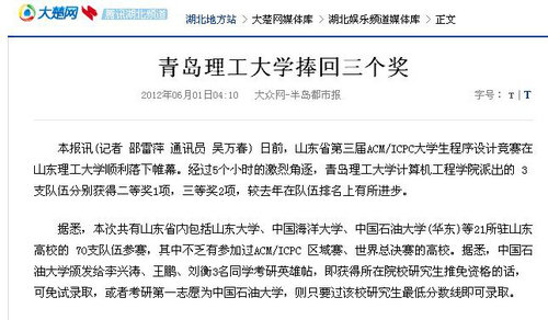 据悉,本次共有山东省内包括山东大学、中国海洋大学、中国石油大学(华东)等21所驻山东高校的 70支队伍参赛,其中不乏有参加过ACM/ICPC 区域赛、世界总决赛的高校。据悉,中国石油大学颁发给李兴涛、王鹏、刘衡3名同学考研英雄帖,即获得所在院校研究生推免资格的话,可免试录取,或者考研第一志愿为中国石油大学,则只要过该校研究生最低分数线即可录取。