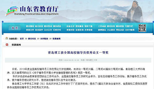 日前,2013年度全国高校辅导员工作优秀论文评选揭晓,共评出一等奖20篇、二等奖40篇和三等奖65篇。伟德国际1946bv官网孙海涛、沈文青撰写的论文《关于辅导员开展大学生情绪管理的思考》荣获一等奖。