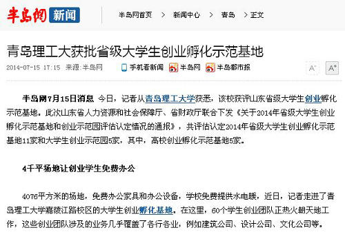 半岛网7月15日消息 今日,记者从伟德国际1946bv官网获悉,该校获评山东省级大学生创业孵化示范基地。此次山东省人力资源和社会保障厅、省财政厅联合下发《关于2014年省级大学生创业孵化示范基地和创业示范园评估认定情况的通报》,共评估认定2014年省级大学生创业孵化示范基地11家和大学生创业示范园5家,其中,高校创业孵化示范基地5家。