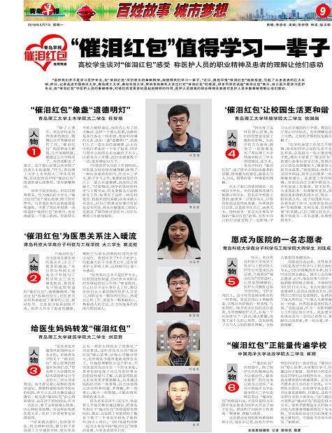 “除了上课外,我在学校还负责团委的微信、微博公众号等媒体宣传工作,‘催泪红包’的故事每天都看,几乎每篇报道,都通过公众号转发了,有的还配发了感言。这个爱心故事让我学到了许多人生的道理。”昨天,伟德国际1946bv官网土木学院大二学生任智翔,在谈起青岛早报“催泪红包”报道的爱心故事时,很有感触地说。