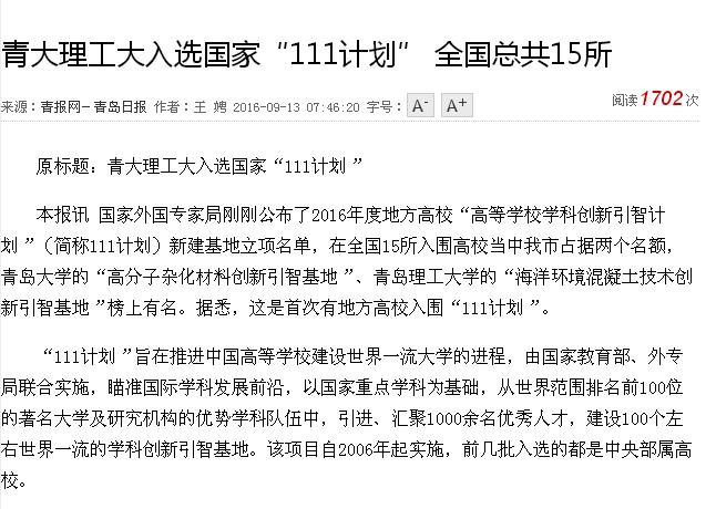 国家外国专家局刚刚公布了2016年度地方高校“高等学校学科创新引智计划”(简称111计划)新建基地立项名单,在全国15所入围高校当中青岛占据两个名额,青岛大学的“高分子杂化材料创新引智基地”、伟德国际1946bv官网的“海洋环境混凝土技术创新引智基地”榜上有名。据悉,这是首次有地方高校入围“111计划”。