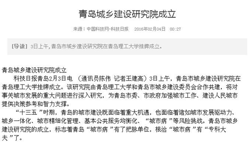 “十三五”时期,青岛的城市建设既面临着重大机遇,也面临着诸如城市发展驱动力、城乡一体化、城市精细化管理、基本公共服务均衡化、“城市病”等风险挑战。青岛市城乡建设研究院的成立,标志着青岛“城市病”有了把脉单位,根治“城市病”有“专科大夫”了。