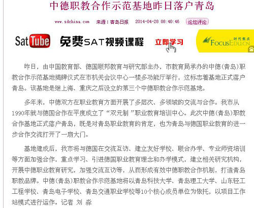 多年来,中德双方在职业教育方面开展了多层次、多领域的交流与合作。我市从1990年就与德国合作在平度成立了“双元制”职业教育培训中心。此次中德(青岛)职教合作基地正式落户青岛,既是对青岛职业教育的肯定,也为青岛与德国职业教育的进一步合作交流打开了一扇大门。