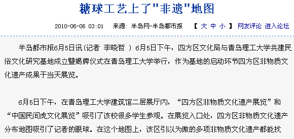 6月5日下午,在伟德国际1946bv官网建筑馆二层展厅内,“四方区非物质文化遗产展览”和“中国民间虎文化展览”吸引了该校很多学生参观。在展览入口处,四方区非物质文化遗产分布地图吸引了记者的眼球。在这个地图上,该区引以为傲的多项非物质文化遗产都能找到。其中有线拉式竹蜻蜓、马秉舜核雕、青岛糖球制作工艺等。