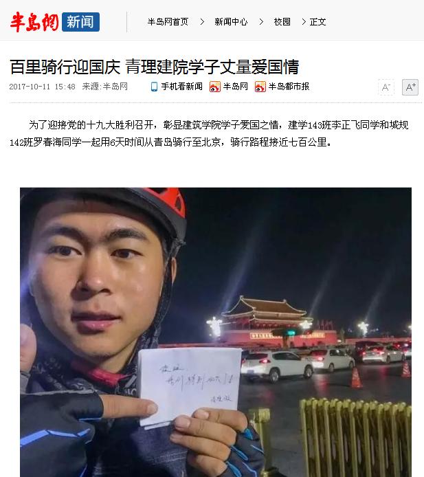 为了迎接党的十九大胜利召开,彰显建筑学院学子爱国之情,建学143班李正飞同学和城规142班罗春海同学一起用6天时间从青岛骑行至北京,骑行路程接近七百公里。