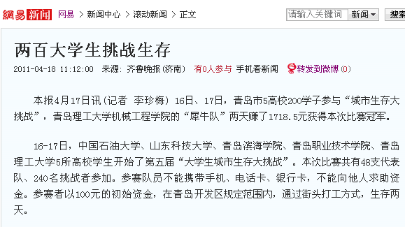 本报4月17日讯(记者 李珍梅) 16日、17日,青岛市5高校200学子参与“城市生存大挑战”,伟德国际1946bv官网机械工程学院的“犀牛队”两天赚了1718.5元获得本次比赛冠军。