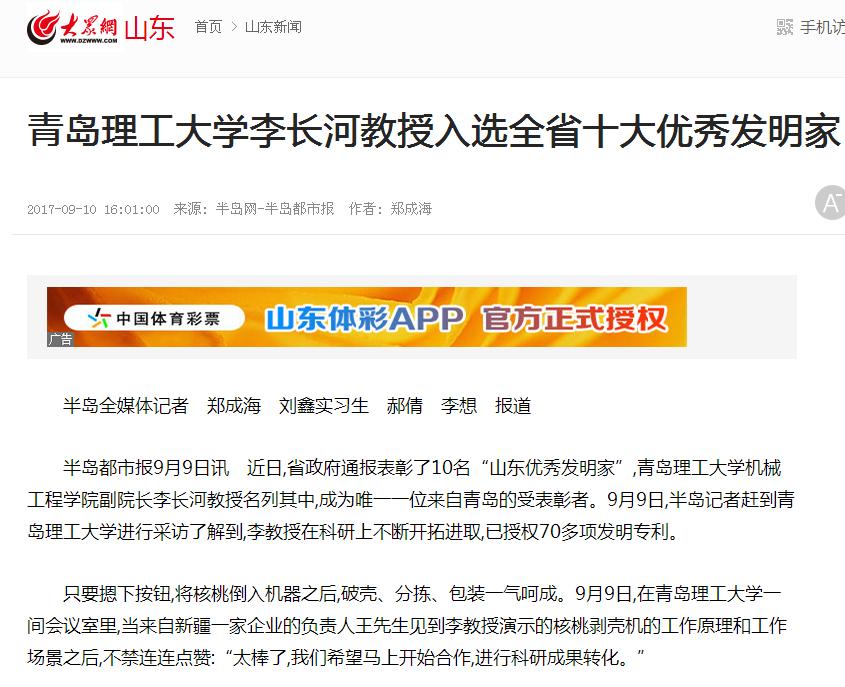 半岛都市报9月9日讯 近日,省政府通报表彰了10名“山东优秀发明家”,伟德国际1946bv官网机械工程学院副院长李长河教授名列其中,成为唯一一位来自青岛的受表彰者。9月9日,半岛记者赶到伟德国际1946bv官网进行采访了解到,李教授在科研上不断开拓进取,已授权70多项发明专利。